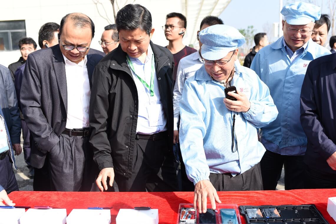 在深科技桂林產(chǎn)品展區(qū),陳朱江向考察團簡要介紹了深科技生產(chǎn)制造的硬盤、磁頭、智能電表等各種產(chǎn)品,并詳細(xì)講解智能手機產(chǎn)品的生產(chǎn)工藝流程。隨后,考察團到一期生產(chǎn)車間參觀,實地了解SMT生產(chǎn)線的工藝流程、產(chǎn)品生產(chǎn)運輸裝配流程及人員管理調(diào)度等情況??疾靾F對深科技的產(chǎn)品多樣性、先進技術(shù)及桂林公司發(fā)展前景表示贊許。
